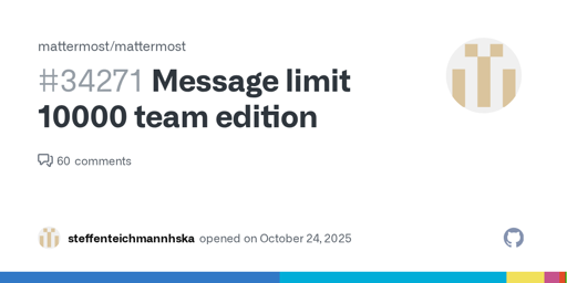 arrow-up156arrow-down1external-linkMattermost restricted access to old messages after 10000 limit is reachedplus-squaregithub.comKing@sh.itjust.worksEnglish · 11 hours agomessage-square13fedilink