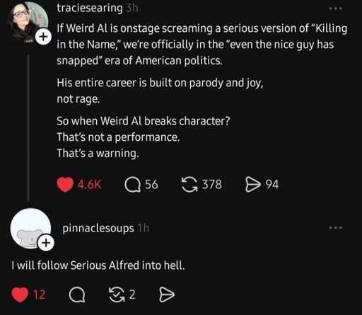 I read this whole thread and still don’t know what happened. I am familiar with some of Portugal the Man’s stuff but I don’t know Killing in the Name. Is the problem that Weird Al went right wing or that he parodied a song seriously instead of with humor?
