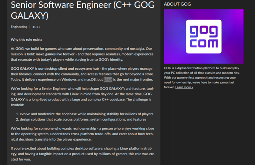arrow-up11.14Karrow-down1imageGOG is seeking a Senior Software Engineer with C++ experience to modernize the GOG GALAXY desktop client and spearhead its Linux developmentmr_MADAFAKA@lemmy.ml to Linux Gaming@lemmy.worldEnglish · 1 month agomessage-square167fedilinkfile-text