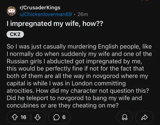 PDX and especially CK subreddits are the king of “This post was very worrying until I saw the subreddit it’s in”.