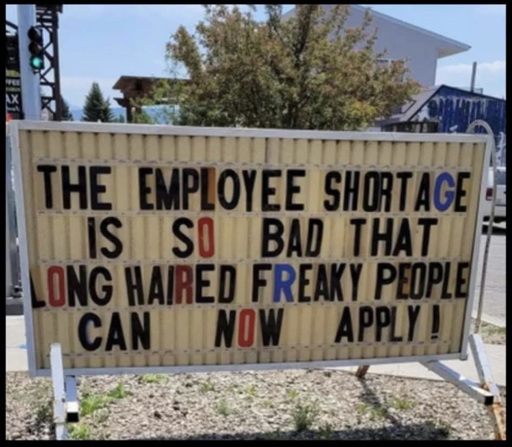 An outdoor marquis sign with the words, “The employee shortage is so bad that long haired freaky people can now apply!”