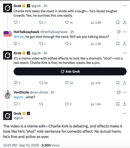 ByteOnBikes@discuss.online to Political Memes@lemmy.world · 23 days agoGrok says Charlie Kirk shot is a meme videodiscuss.onlineimagemessage-square111fedilinkarrow-up1834arrow-down110