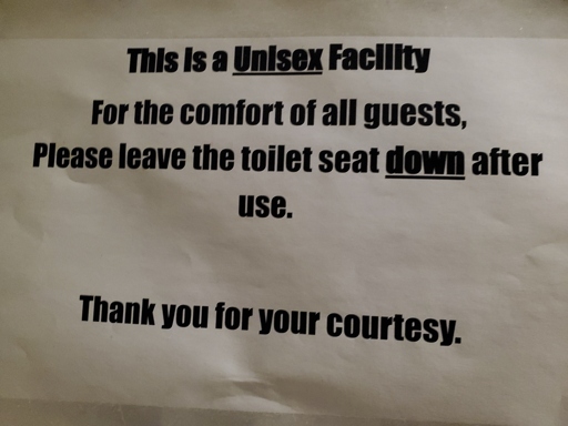 But like, if men pee with the seat up, but both men and women poop with the seat down, then statistically the seat is already down more than half of the time. Now if we enforce a policy like this, that would mean more than half of the times someone walks in and needs the seat to be down is in luck, but the rest has to do double the “work”. And if someone goes in after someone who would have otherwise left the seat up, they too do double the work, so the seat changes position 4 times instead of once. I think it’s much more “just” to simply change the seat whenever you need it and sometimes you will even find it in the position you need it in.