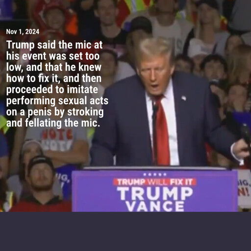 trek32@lemmy.world to Political Memes@lemmy.world · 1 year agoAnother record broken! Trump is the only president to simulate sucking a penis at a large public gatheringplus-squarelemmy.worldimagemessage-square0fedilinkarrow-up10arrow-down10