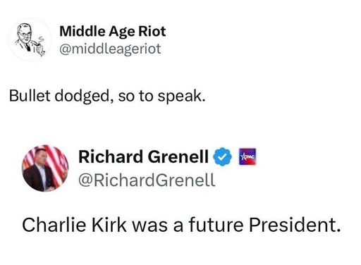 arrow-up1288arrow-down1imageBullet dodged... for us lemmy.worldickplant@lemmy.world to Political Memes@lemmy.world · 4 hours agomessage-square17fedilink