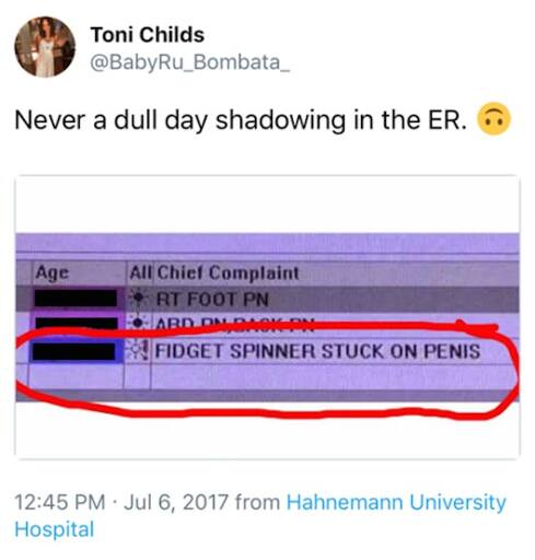 For a horrifying moment I thought it read “Fidget spinner stuck in penis”.