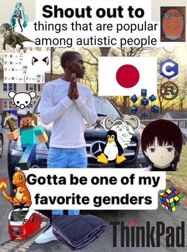 You forgot pride flags, blahaj, astronomy, and psychedelics. I would also say far-left politics, but there’s plenty of right-wing autists out there too.
