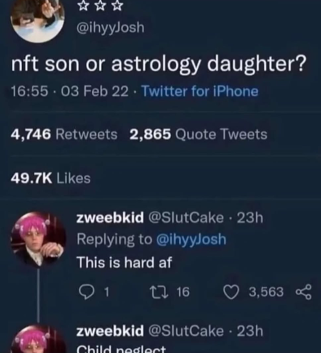 I don’t want children, especially in a world that’s getting worse every day. And NFTs pretty much sum up many of the causes that have led us to this situation.