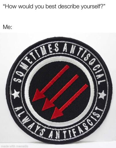Many anti-fascists today also use the logo of Antifaschistische Aktion, an explicitly Marxist-Leninist paramilitary group. That’s the one with the two flags. Sometimes Anarchists will change the semiotics of the symbol, by making the flag in front black, to signal their specific ideological commitments.