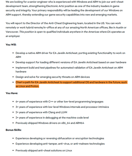 arrow-up1407arrow-down1imageEA is hiring a Senior Anti-Cheat Engineer to lead development of a native ARM64 driver for their Javelin kernel anti-cheat system and start laying groundwork for Linux/Proton supportmr_MADAFAKA@lemmy.ml to Linux Gaming@lemmy.worldEnglish · 2 months agomessage-square108fedilinkfile-text