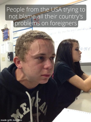 The meme is expressing is general frustration that I commonly experience when engaging fellow Americans in political discourse. It is undeniable that it is very common for Americans to blame their problems on foreign nations or peoples. The meme does not express hatred of the general American population and I am uncertain where you got that idea. If you could elaborate I would appreciate that. Believe it or not a 14 word meme meant to vent frustration does not express the full complexity of my political and social views.