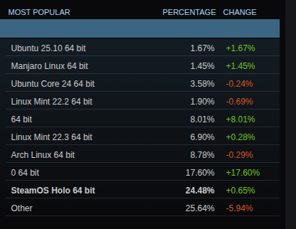 “0 64bit” must be a few distributions lumped together by a processing script. “64bit” is probably CachyOS when comparing to last month’s stats the ~8% match: