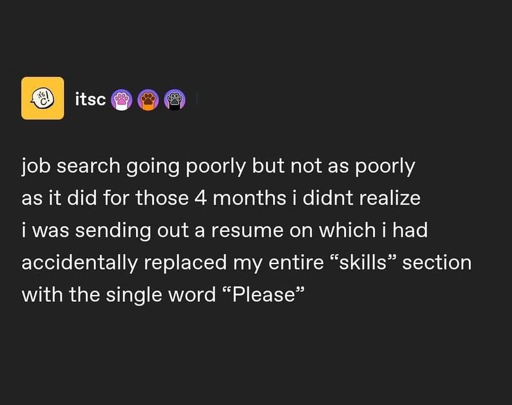 Fun fact! PLEASE is an actual skill in Dialectal Behavior Therapy and we’ll probably be covering it within the next couple months over on !DIYMentalHealth@lemmy.dbzer0.com. Please subscribe and get active if you’re looking to improve your mental health lately! The main page of our wiki has a quickstart guide if you’re looking for something you could even do today to help stabilize yourself a little.