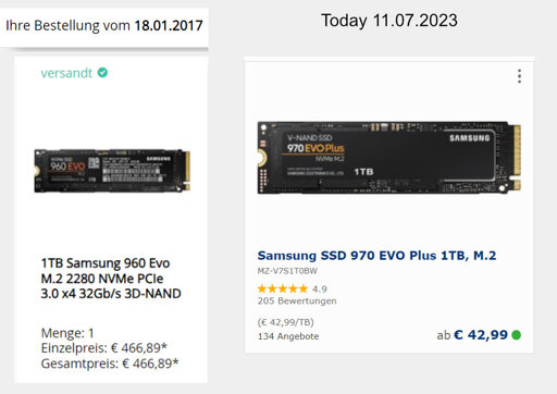 OrangeCorvus@lemmy.world to Technology@lemmy.worldEnglish · edit-22 years agoIn 2017, I bought a 1TB 960 Evo for 466€. Now, in 2023 the 1TB 970 Evo Plus is 43€.plus-squarelemmy.worldimagemessage-square0fedilinkarrow-up11arrow-down10