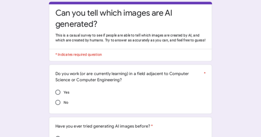 popcar2@programming.dev to Technology@lemmy.worldEnglish · 2 years ago[Survey] Can you tell which images are AI generated?plus-squareforms.gleexternal-linkmessage-square1fedilinkarrow-up10arrow-down10