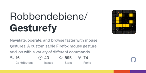 arrow-up11arrow-down1external-linkGesturefy: Navigate, operate, and browse faster with mouse gestures! A customizable Firefox mouse gesture add-on with a variety of different commands.plus-squaregithub.comsag@lemm.ee to Open Source@lemmy.ml · 1 year agomessage-square0fedilink